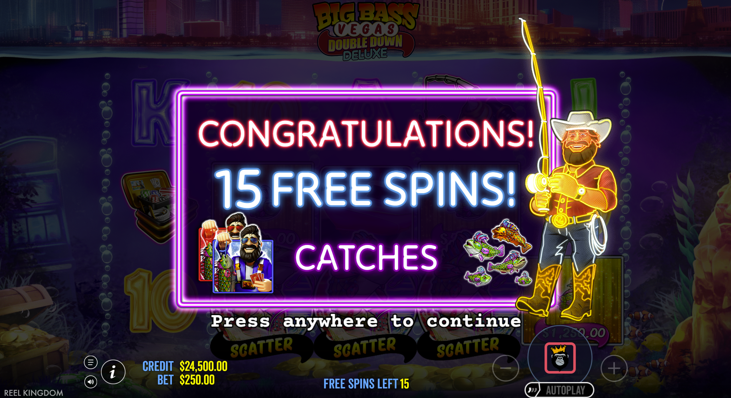 In the base game and free spins, the fisherman wild can appear in two ways: Standard Wild: Collects the values of all money fish on the screen and awards +1 extra free spin (in the bonus round). Double Down Wild: This special version does everything the standard wild does, but then DOUBLES the total collected amount before awarding it. This single feature can instantly create a monster win.